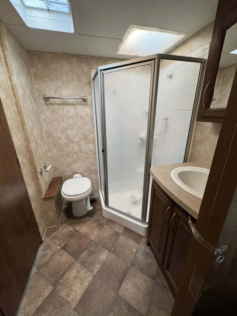 Full bathroom with shower, toilet, and vanity