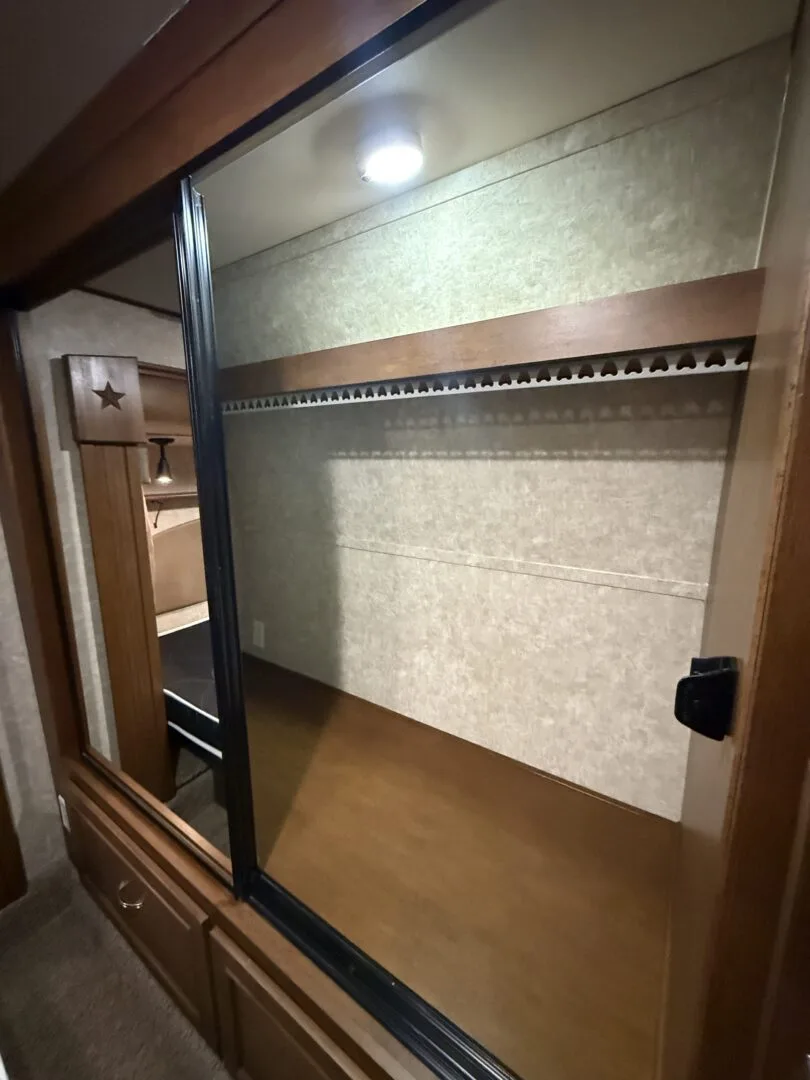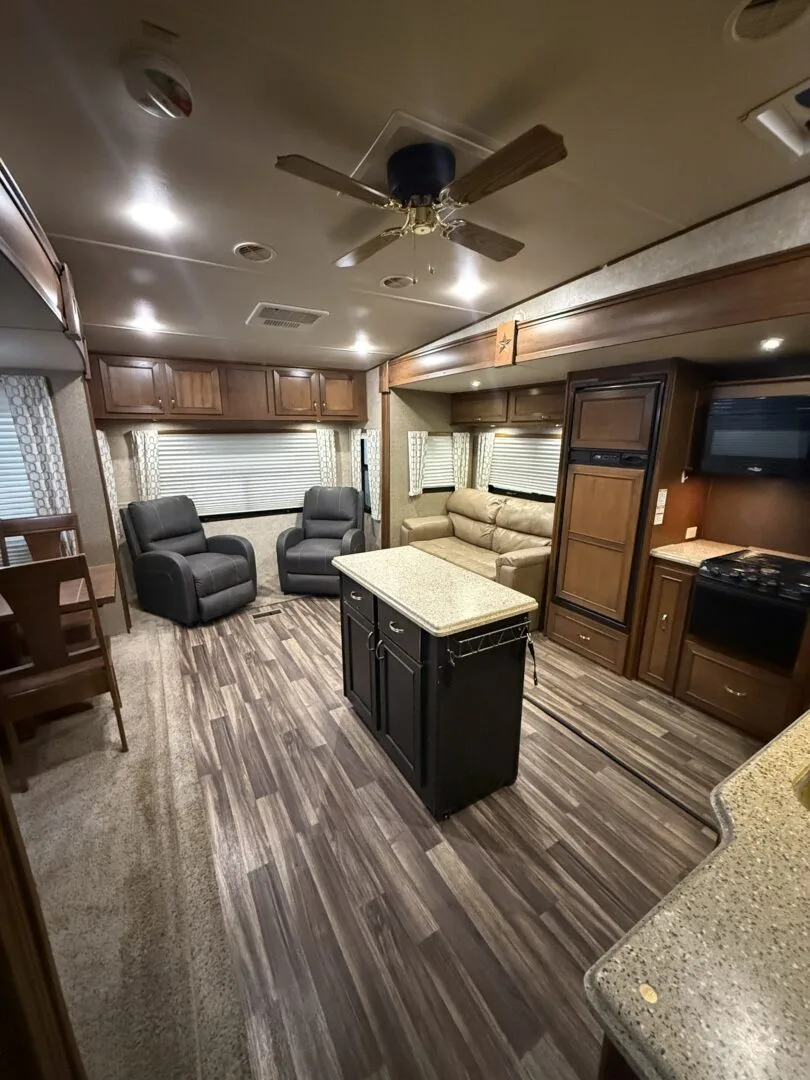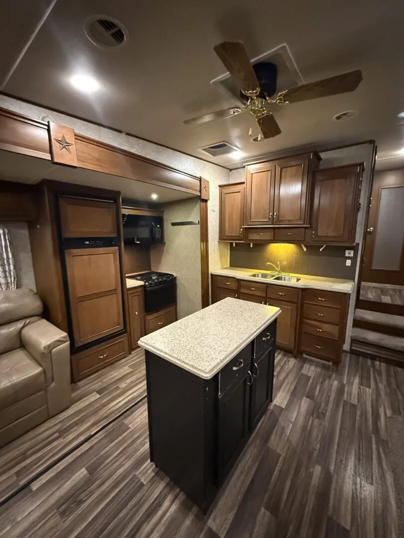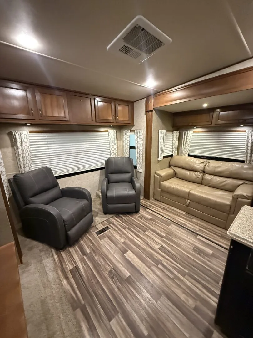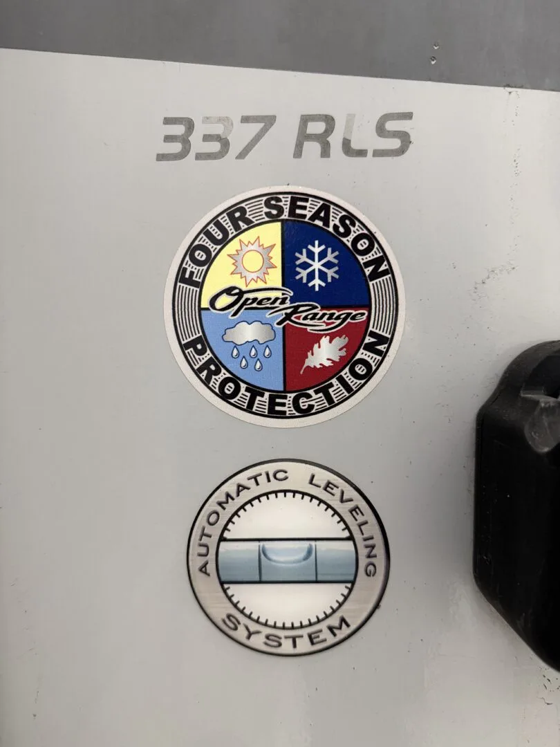 The 2015 Open Range Roamer 337RLS is a luxurious three-slideout fifth wheel known for its wide-body design (100 inches), residential-style rear living area, and excellent storage capacity. It features a 4-season package with R-38 insulation, making it suitable for year-round, full-time living in comfort.