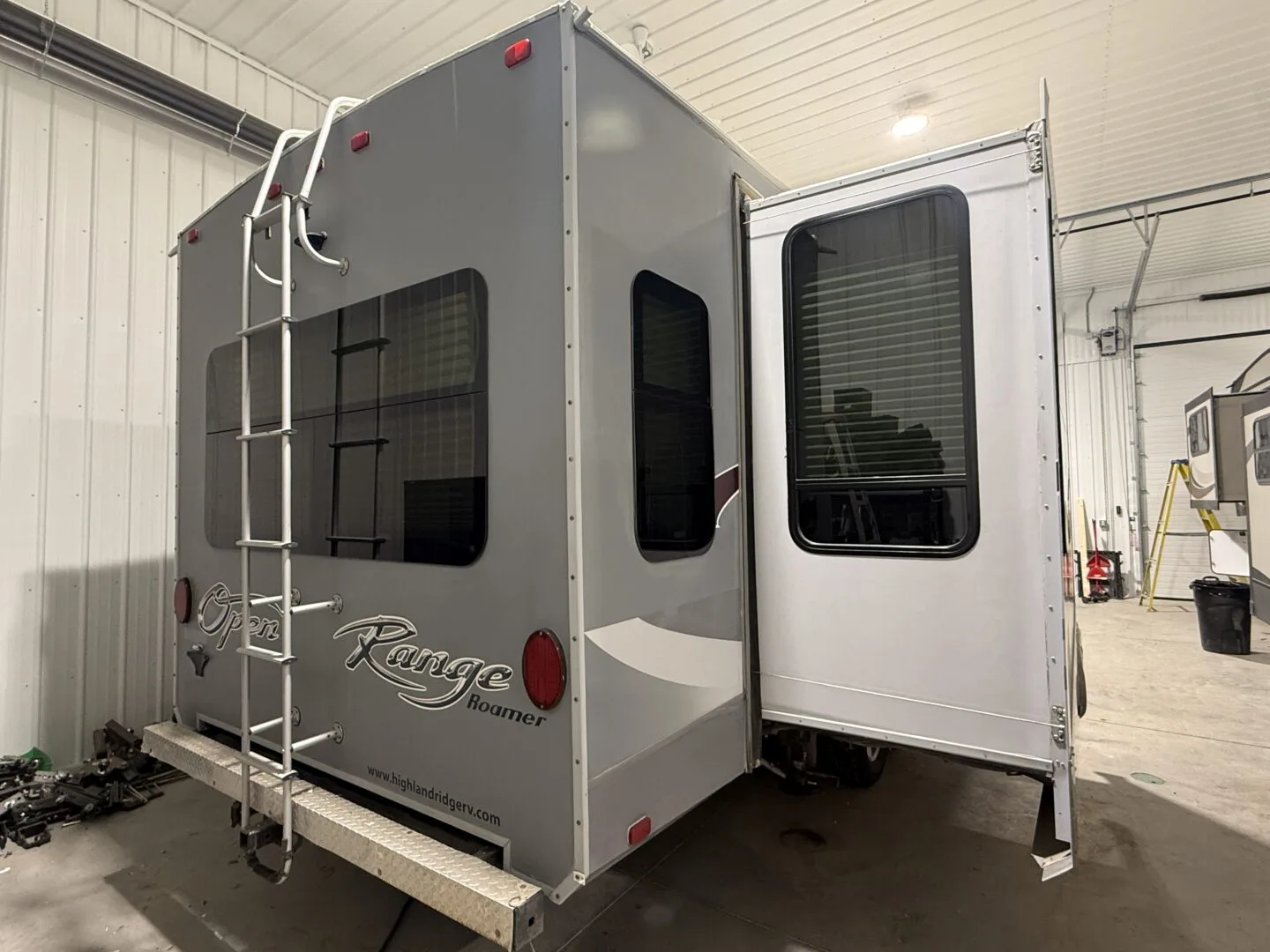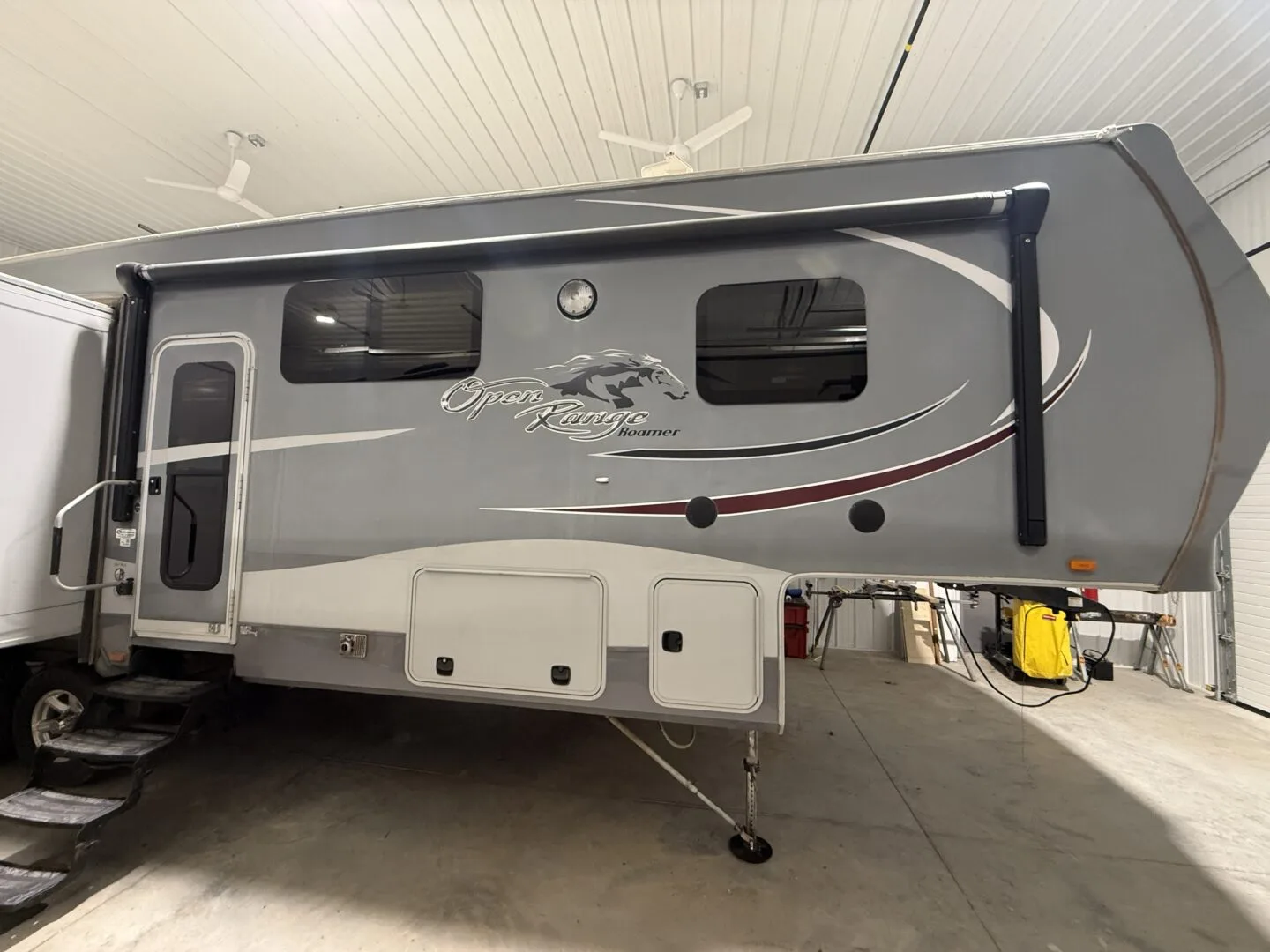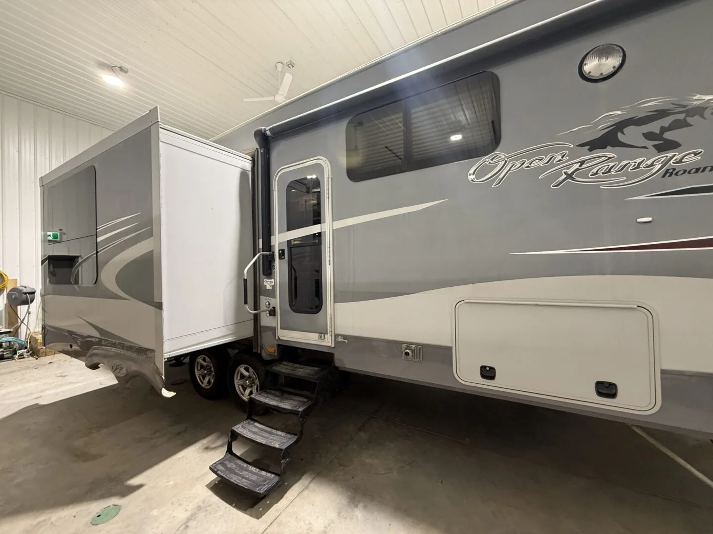 The 2015 Open Range Roamer 337RLS is a luxurious three-slideout fifth wheel known for its wide-body design (100 inches), residential-style rear living area, and excellent storage capacity. It features a 4-season package with R-38 insulation, making it suitable for year-round, full-time living in comfort.