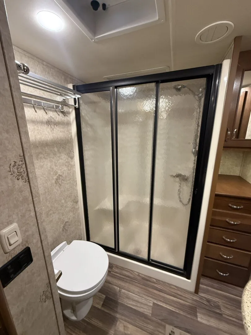Full bathroom with MASSIVE SHOWER, toilet, and vanity