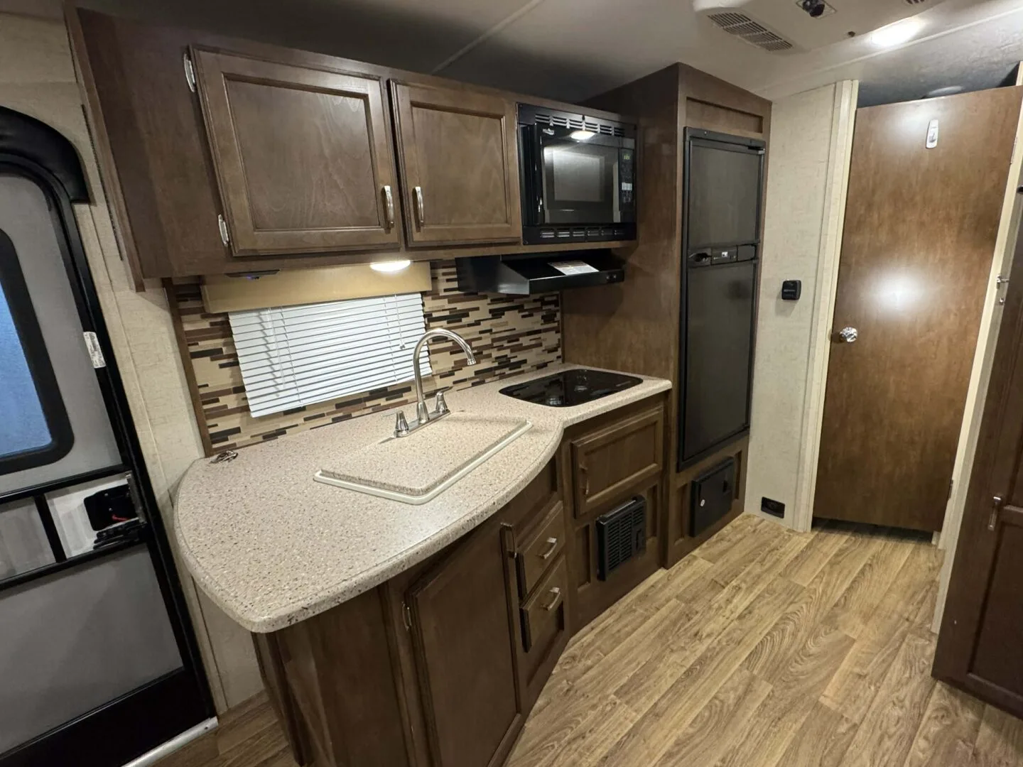 -Nice Kitchen with 2 burner stove, microwave stylish sink, fridge and good counter space.